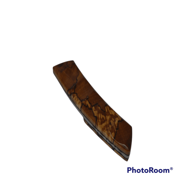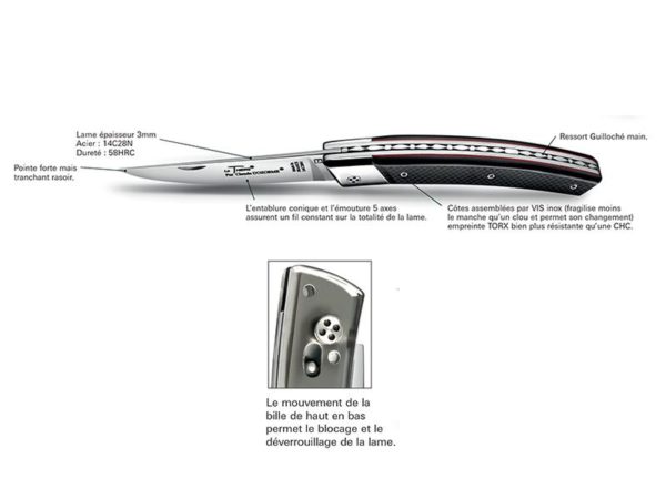 Manche : Hêtre stabilisé debout. Le bois stabilisé est saturé de résine synthétique par un procédé technique exclusif. Le hêtre debout stabilisé possède ainsi les qualités techniques d’une résine mais conserve toutes ses qualités esthétiques pour que votre couteau Le Thiers ® conserve son sublime aspect dans le temps. Lame : Acier…
